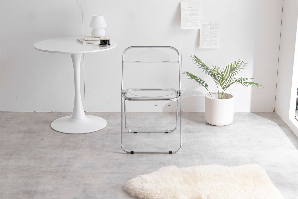 クリア座面とシルバーフレームの組み合わせが印象的な『Glace(グラース)』折りたたみクリアチェア