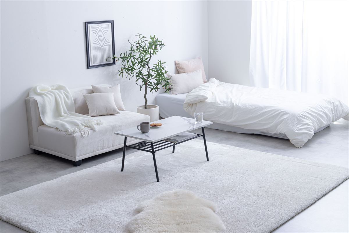美しい天板とマットなスチール脚を組み合わせた『Rio(リオ)』棚付きセンターテーブル