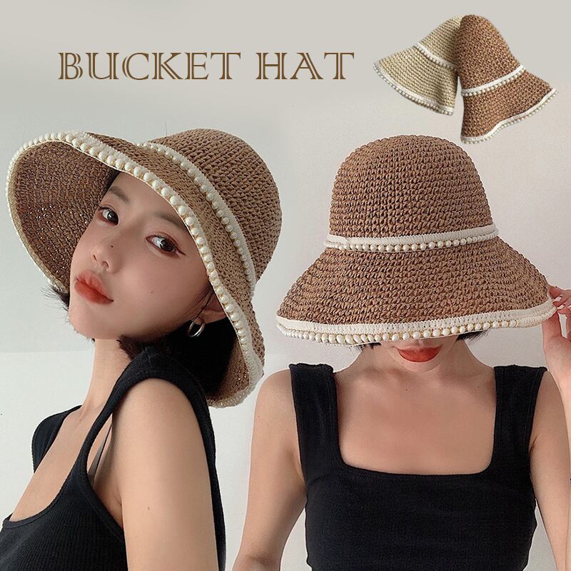 レディース 紫外線対策 バケットハット パール 涼しい つば広 黒 通気性 麦わら風帽子 立体的